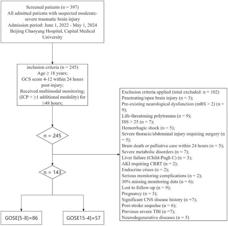 This study used a retrospective observational cohort design. We consecutively included all eligible patients with moderate-to-severe traumatic brain injury (msTBI) admitted to Beijing Chao-Yang Hospital, affiliated with Capital Medical University, between June 1, 2022, and May 1, 2024. Inclusion criteria were as follows: (1) Age ≥ 18 years; (2) Diagnosis of msTBI, defined as a Glasgow Coma Scale (GCS) score between 4 and 12 within 24 hours after injury; (3) Receipt of standardized multimodal intracranial monitoring after admission. This included ICP monitoring plus at least one additional monitoring modality (such as PbtO2 or cerebral microdialysis), with continuous monitoring for ≥ 48 hours. Exclusion criteria included: (1) Penetrating or open brain injuries (e.g., gunshot wounds, stab wounds, open skull fractures with exposed brain tissue); (2) Pre-existing severe neurological dysfunction, defined as a modified Rankin Scale (mRS) score > 2; (3) Life-threatening polytrauma meeting any of the following: 1. Injury Severity Score (ISS) > 25; 2. Hemorrhagic shock (systolic blood pressure < 90 mmHg for > 30 minutes or requiring ≥ 4 units of red blood cell transfusion); 3. Severe thoracic or abdominal organ injury (Abbreviated Injury Scale [AIS] score ≥ 3) requiring emergency surgery; (4) Signs of brain death on admission or early stage, or receipt of palliative care/withdrawal of active treatment within 24 hours after monitoring initiation; (5) Severe metabolic disorders or systemic diseases that could interfere with cerebral metabolism monitoring, including: 1. Severe liver failure (Child-Pugh class C); 2. Acute kidney injury requiring continuous renal replacement therapy (CRRT); 3. Uncontrolled thyroid storm or adrenal insufficiency; (6) Serious complications during monitor placement (e.g., intracranial hematoma requiring surgical evacuation) that could affect data reliability or outcomes; (7) Missing > 30% of multimodal monitoring data (calculated hourly over 5 consecutive days); (8) Loss to follow-up or incomplete key clinical outcome data; (9) Pregnancy (due to potential effects of physiological changes on cerebral perfusion and oxygenation parameters); (10) History of central nervous system diseases that could significantly affect prognosis or interpretation of monitoring, including: 1. Post-stroke sequelae (mRS ≥ 2); 2. History of severe traumatic brain injury with persistent neurological deficits; 3. Progressive neurodegenerative diseases (e.g., Alzheimer’s disease, Parkinson’s disease). The enrollment process is detailed in (Figure 1).