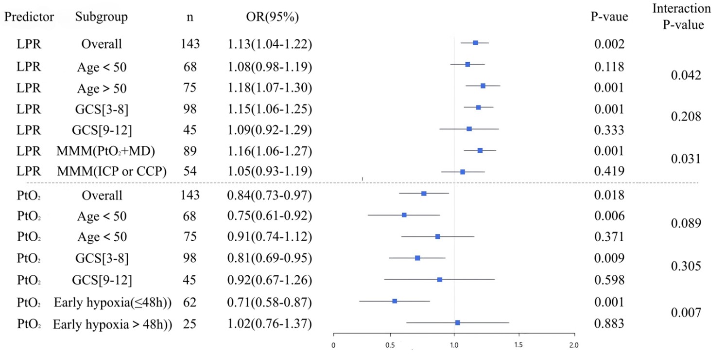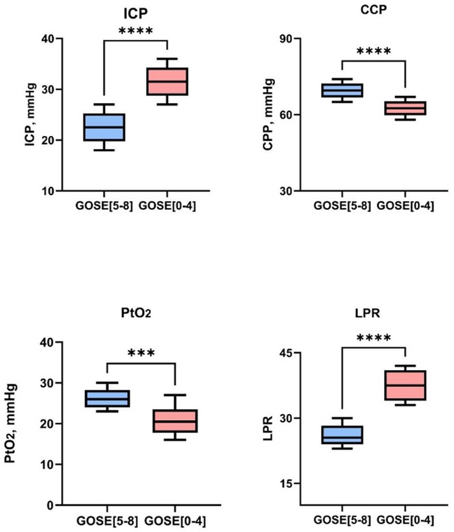 All monitoring was performed according to institutional standard operating procedures. Data from the first 5 days after the start of monitoring were extracted from the bedside monitoring system: 1. Intracranial pressure (ICP) and cerebral perfusion pressure (CPP): Continuously monitored using an intraparenchymal probe (e.g., Codman or Camino). The daily mean values were recorded. 2. Brain tissue oxygen tension (PbtO2): Monitored using a Licox or Neurovent-PTO probe. The daily mean values were recorded. 3. Cerebral microdialysis (MD): A CMA microdialysis system (MT100+Brain Neurochemical Analysis System, ANATECH (Beijing) CO., LTD) was used. Samples were collected every 60 minutes. The lactate/pyruvate ratio (LPR) was analyzed, and the daily mean values were calculated. For analytical purposes, the above monitoring parameters were dichotomized according to widely accepted clinical thresholds: ICP > 20 mmHg; CPP < 60 mmHg; PbtO2 < 20 mmHg; LPR > 25.