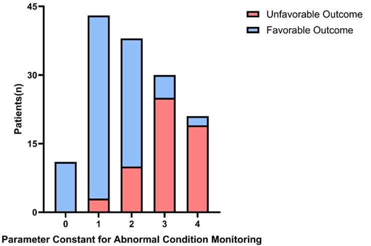 The primary outcome measure was neurological functional outcome at 6 months post-injury, assessed using the Glasgow Outcome Scale-Extended (GOSE) [13-15]. Trained research personnel conducted the assessments during follow-up clinic visits or via telephone interviews. The GOSE scores range from 1 to 8, categorized as follows: Unfavorable Outcome: GOSE score 1-4 (including: 1. death; 2. vegetative state; 3-4. severe disability). Favorable Outcome: GOSE score 5-8 (including: 5-6. moderate disability; 7-8. good recovery). Based on the 6-month GOSE assessment, patients were dichotomized into two groups: the Favorable Outcome group (n=86, 60.1%) and the Unfavorable Outcome group (n=57, 39.9%).