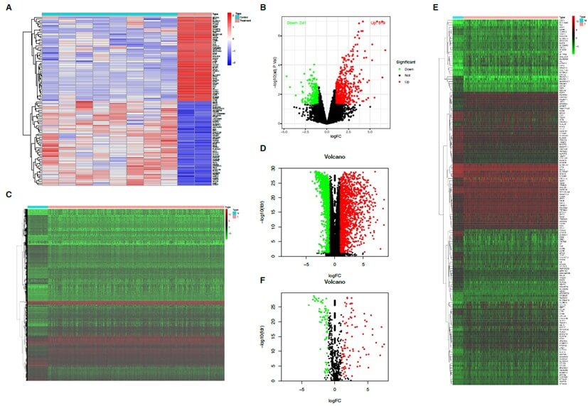 A) Heatmap of gene expression in the experimental and control groups from the GEO dataset (GSE66463). The heatmap illustrates the overall differences in gene expression between the experimental and control groups. The x-axis represents samples, while the y-axis represents genes. Red indicates high expression, and blue indicates low expression, clearly highlighting the significant differences between the two groups. B) Volcano plot of gene expression in the experimental and control groups from the GEO dataset (GSE66463): The volcano plot uses log2 fold change (log2FC) on the x-axis and -log10 adjusted p-value on the y-axis. Red dots represent significantly upregulated genes, green dots represent significantly downregulated genes, and black dots represent genes with no significant difference. C) Heatmap of differential gene expression between tumor and normal tissues in thyroid cancer brain metastasis genes extracted from TCGA clinical data: The heatmap compares gene expression between tumor and normal tissues. Red indicates high expression, and green indicates low expression. Clustering analysis of samples and genes highlights the differences in expression patterns between tumor and normal tissues. D) Volcano plot of differential gene expression between tumor and normal tissues in thyroid cancer brain metastasis genes extracted from TCGA clinical data: The volcano plot intuitively displays the distribution of differentially expressed genes between tumor and normal tissues in thyroid cancer brain metastasis genes. Red dots represent significantly upregulated genes, and green dots represent significantly downregulated genes, revealing significant changes in tumor-related genes. E) Heatmap of differential expression comparison between tumor and normal tissues in the thyroid cancer brain metastasis gene set derived from the intersection of GEO and TCGA: This heatmap focuses on the expression differences in the thyroid cancer brain metastasis gene set derived from the intersection of GEO and TCGA between tumor and normal tissues. Red and green correspond to high and low expression areas, respectively, illustrating the potential role of the gene set in tumor development. F) Volcano plot of differential expression comparison between tumor and normal tissues in the thyroid cancer brain metastasis gene set derived from the intersection of GEO and TCGA. The volcano plot intuitively presents the significantly upregulated and downregulated genes (red and green dots, respectively) in the thyroid cancer brain metastasis gene set, further emphasizing the key expression differences between tumor and normal tissues.