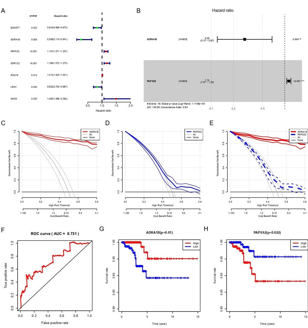 A) The forest plot of key prognostic genes in thyroid cancer brain metastasis (TCBM) displays the hazard ratios (HR) and 95% confidence intervals (CI) of the key prognostic genes associated with TCBM, with significant p-values annotated. Genes with HR > 1 (e.g., PAPSS2, GPR132, RGS16) are considered high-risk genes, while those with HR < 1 (e.g., ADRA1B, LRG1) are considered low-risk genes and may have protective or tumor-suppressive functions. B) The multivariate Cox regression analysis of TCBM genes demonstrates the risk contributions of ADRA1B (HR = 0.29, p = 0.004) and PAPSS2 (HR = 1.14, p < 0.001) in TCBM. The results indicate that ADRA1B is a protective factor, while PAPSS2 is a risk factor. C) The DCA curve of the single-gene prediction model based on ADRA1B (Model 1) analyzes the mortality chances of the ADRA1B gene at high-risk thresholds for TCBM, showing good predictive performance. D) The DCA curve of the single-gene prediction model based on PAPSS2 (Model 2) analyzes the mortality chances of the PAPSS2 gene at high-risk thresholds for TCBM, indicating good predictive performance. E) The combined DCA of Model 1 and Model 2 highlights the comparison of mortality chances for the ADRA1B and PAPSS2 genes at high-risk thresholds for TCBM, demonstrating good predictive performance for both genes. F) The ROC curve of the multivariate risk model based on the ADRA1B and PAPSS2 genes. The AUC value of 0.731 indicates good discriminatory performance, suggesting potential clinical diagnostic value. G) The survival analysis curve shows that patients with high expression of the ADRA1B gene have significantly better survival rates than those with low expression (p = 0.01), suggesting its potential tumor-suppressive role. H) The survival analysis curve shows a significant decrease in survival rates for patients with high expression of PAPSS2 (p = 0.022), suggesting its potential oncogenic role.