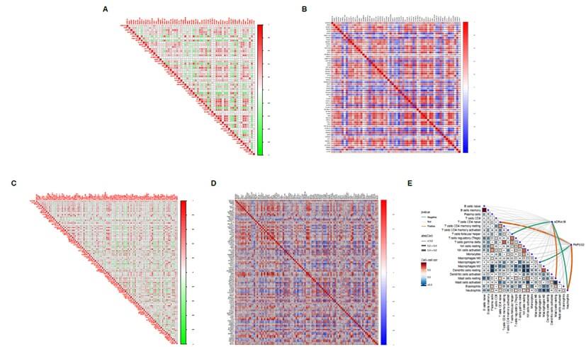 A) Heatmap of the correlation matrix between the core gene ADRA1B of thyroid cancer brain metastasis and immune genes (green-red gradient). This matrix displays the correlation between the core gene ADRA1B of thyroid cancer brain metastasis and immune genes, with green indicating negative correlation and red indicating positive correlation. The intensity of the colors reflects the magnitude of the correlation coefficients. B) Heatmap of the correlation between the core gene ADRA1B of thyroid cancer brain metastasis and immune genes (blue-red gradient). This matrix represents the direction and strength of the correlation between the core gene ADRA1B of thyroid cancer brain metastasis and immune genes using a blue-to-red gradient. Blue indicates negative correlation, red indicates positive correlation, and the darker the color, the stronger the correlation. C) Heatmap of the correlation matrix between the core gene PAPSS2 of thyroid cancer brain metastasis and immune genes (green-red gradient). This matrix displays the correlation between the core gene PAPSS2 of thyroid cancer brain metastasis and immune genes. Green indicates negative correlation, red indicates positive correlation, and the intensity of the colors represents the strength of the correlation coefficients. D) Heatmap of the correlation between the core gene PAPSS2 of thyroid cancer brain metastasis and immune genes (blue-red gradient). This matrix shows the correlation between the core gene PAPSS2 of thyroid cancer brain metastasis and immune genes using a blue-to-red color gradient. Blue represents negative correlation, red represents positive correlation, and the deeper the color, the more significant the correlation. E) Immune cell infiltration map of the core genes (ADRA1B and PAPSS2) in thyroid cancer brain metastasis. This map displays the significant correlation between key genes (such as ADRA1B and PAPSS2) and different immune cell types. The color of the lines indicates the direction of the correlation (orange for positive correlation and green for negative correlation), and the thickness of the lines reflects the strength of the correlation. Significance is annotated based on p-values, showing the potential interaction between the core genes (ADRA1B and PAPSS2) and immune cells in the tumor microenvironment.