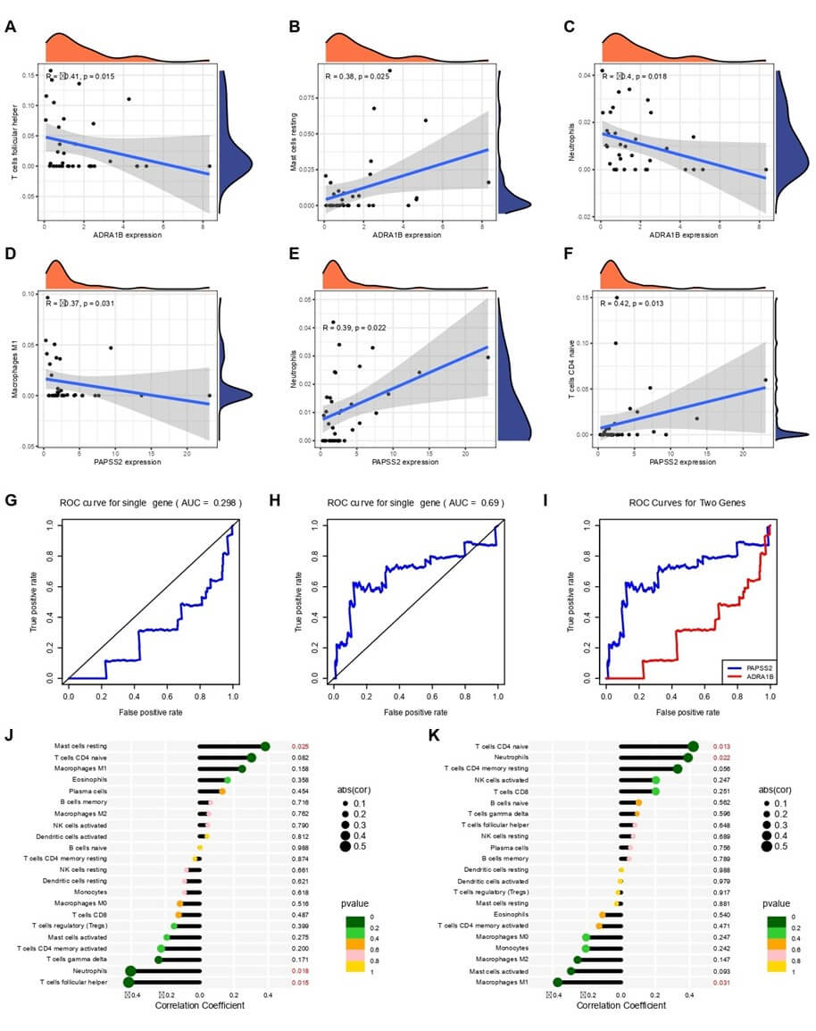 We employed a transcription-based immune infiltration analysis method to evaluate the relationship between the expression levels of the ADRA1B and PAPSS2 genes and the infiltration of different types of immune cells. First, we used R language tools to obtain the estimated values of immune cell infiltration from the TCGA database, including various immune cell types such as T cells, B cells, macrophages, and dendritic cells. Subsequently, we assessed the correlation between the expression levels of the ADRA1B and PAPSS2 genes and the degree of infiltration of various immune cells using Pearson correlation analysis. The correlation analysis was performed in R software, with the cor.test function used to calculate the correlation coefficients and p-values. The analysis results were presented in the form of heatmaps and scatter plots to demonstrate the strength and direction of the relationship between gene expression and immune cell infiltration.