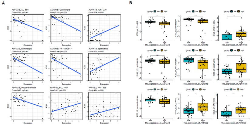 To assess the association between specific gene expression and drug sensitivity, we calculated the correlation coefficients between gene expression levels and drug IC50 values. We first collected the expression data of the core genes ADRA1B and PAPSS2 in thyroid cancer brain metastasis samples, along with the corresponding drug IC50 values, ensuring that all data were appropriately preprocessed. We then used the Pearson correlation coefficient to quantify the linear relationship between gene expression levels and drug IC50 values. The Pearson correlation coefficient (r) ranges from -1 to 1, with positive values indicating positive correlation, negative values indicating negative correlation, and values close to 0 indicating no linear correlation. We subsequently conducted significance tests for the correlation coefficients between each gene and drug IC50 values to determine whether the observed correlations were statistically significant (using the cor.test function for Pearson correlation coefficient significance testing, which actually performed a two-tailed test). A correlation coefficient of R < -0.6 or > 0.6 was considered to indicate a strong correlation (-1 < r < 1).