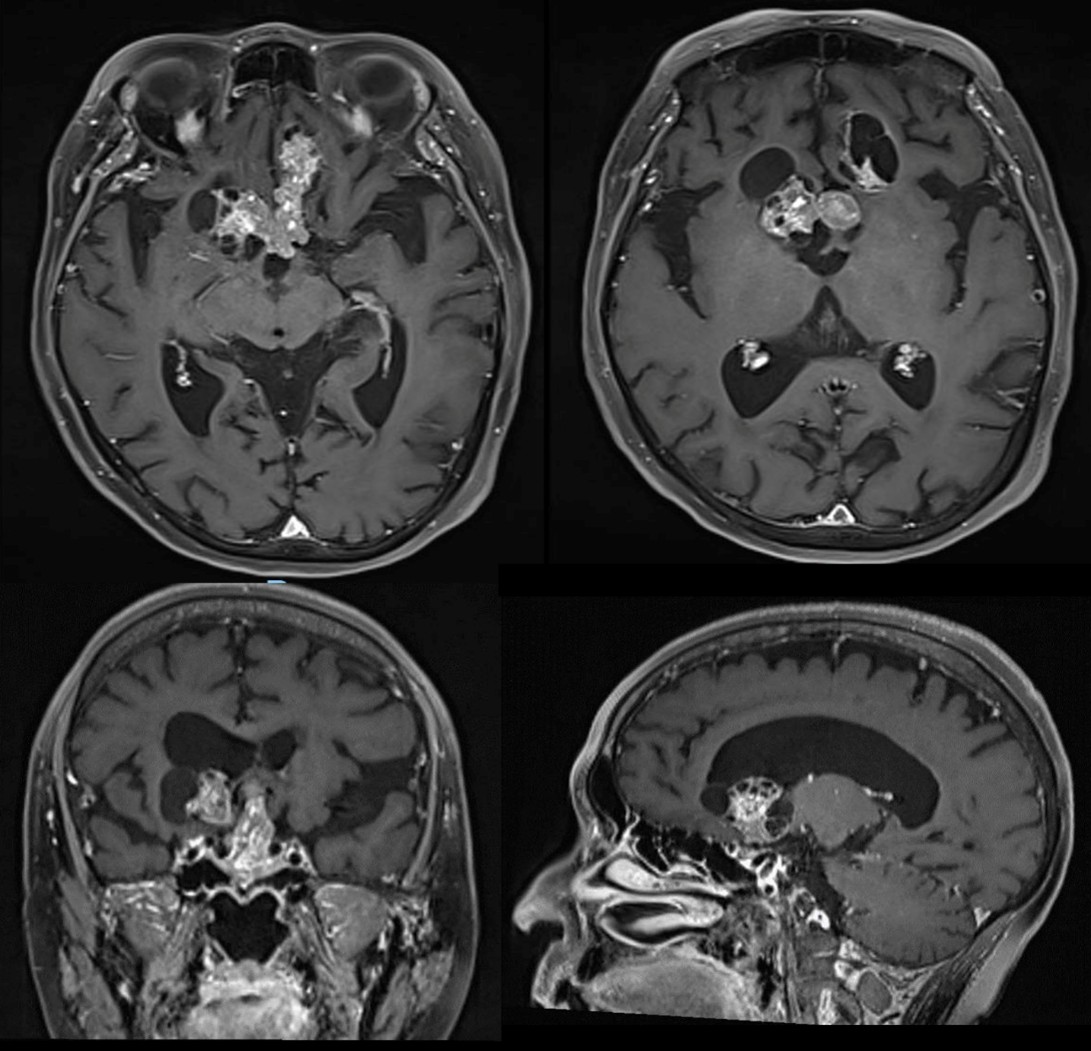 MRI with contrast confirmed tumor recurrence finding a predominantly suprasellar solid tumor significantly shifting upwards the third ventricle with anteriorly extension to the basal frontal gyrus in the anterior cranial fossa and a lateral cystic component (Figure 1). Surgical transcranial resection was decided.