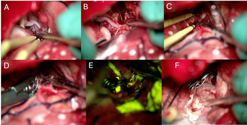 During surgery, the patient was placed in supine position with a neutral position of the head. A three-point fixation system and neuro-navigation system (BrainLab) were used. A bicoronal incision with bifrontal craniectomy were performed, using a subfrontal corridor for the tumor resection. Conventional microsurgery techniques were applied for initial tumor resection in its frontal extension; further dissection was carried out following anatomic landmarks until finding the arterial anterior communicating complex and the optic nerves surrounded by tumor. Careful dissection was then performed for the liberation of the optic apparatus continuing with the tumor resection between the quiasma and the AcommA (Figure 2). During this step a superior projection AcommA aneurysm was identified inside the solid central part of the tumor (video/imagen). After delimitation simultaneous tumor resection and dissection of the aneurysm was performed in order to clip it. After complete liberation of the aneurysm a 5 mm fenestrated clip was located in the neck of the lesion corroborating afterwards its complete occlusion using fluorescein. Haemostasis was confirmed, and closure was performed conventionally (Figure 3).