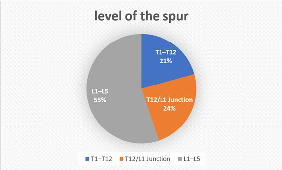 MRI scans revealed that a low-lying conus was the most frequently associated finding, identified in 97% of patients. The most common level was at the L3, in 46% of cases. Despite the prevalence of low-lying conus, only 32% of patients exhibited neurological deficits. Type I SCM was the most frequently encountered type, representing 97% of cases, with the majority of spurs located in the lumbar spine (55%).