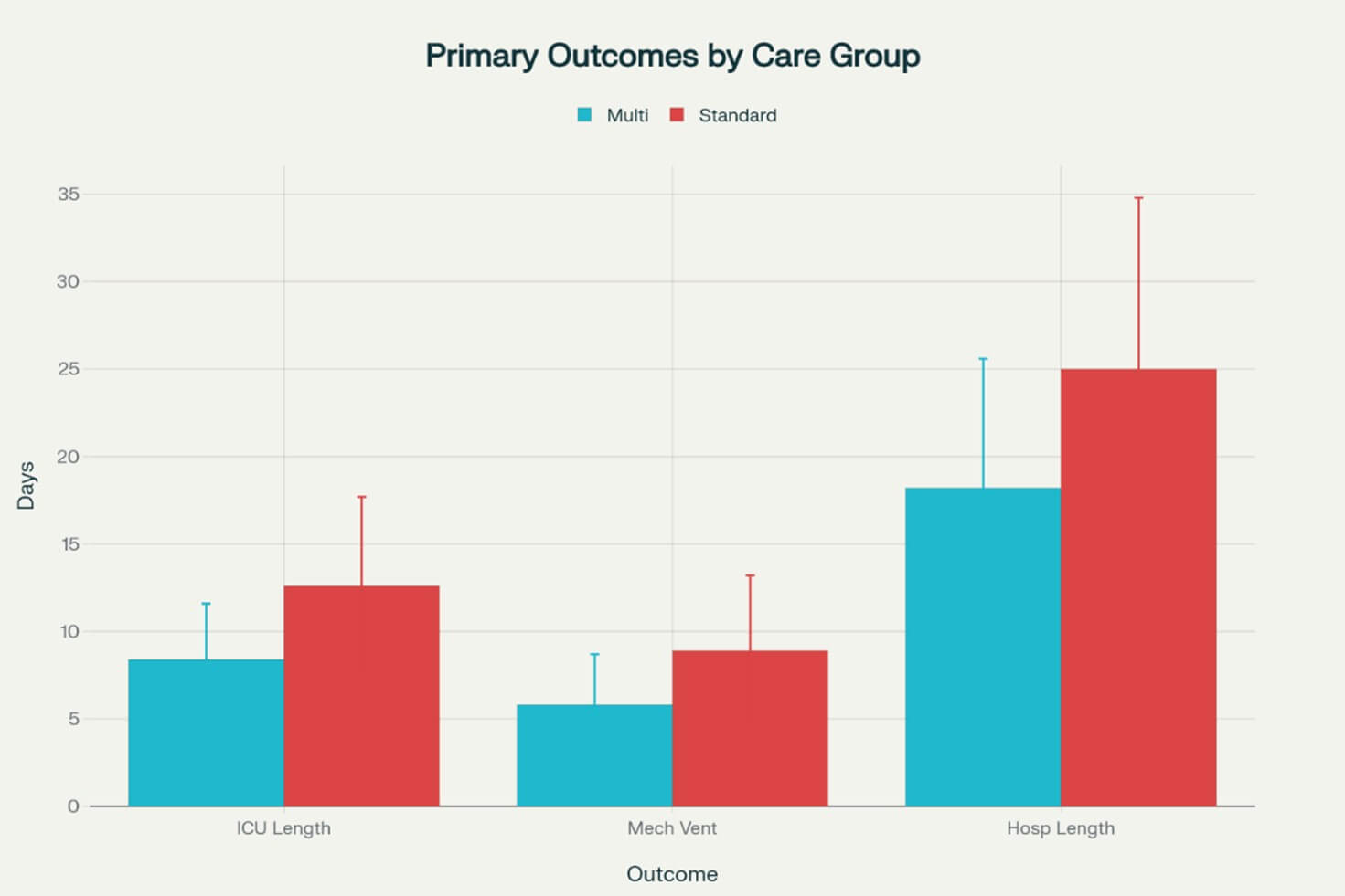 Results: The multidisciplinary approach demonstrated significant reductions in ICU stay (mean difference: 4.2 days, 95% CI: -6.5 to -1.9, p<0.001), mechanical ventilation duration (mean difference: 3.1 days, 95% CI: -5.2 to -1.0, p=0.002), and hospital length of stay (mean difference: 6.8 days, 95% CI: -11.4 to -2.2, p<0.001). Family psychological burden scores were significantly lower in the multidisciplinary care group (32.1±8.7 vs 41.8±12.3, p=0.001), with improved coping mechanisms and reduced caregiver stress.